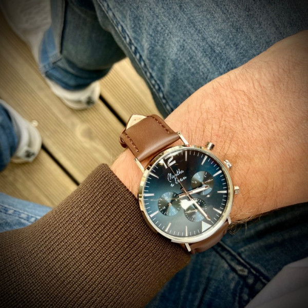 Ø 41 mm (homme) - Cadran bleu avec index assortis - Verre minéral bombé - aiguilles phosphorescentes - Etanche 50M - Montre fournie dans son écrin luxe spécifique - Bracelet en cuir marron - Montre fabriquée en France à Besançon.