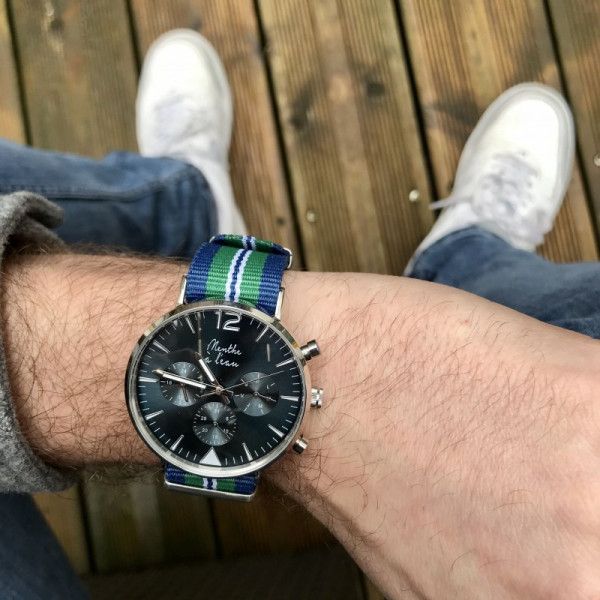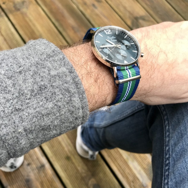 Ø 41 mm (homme) - Cadran bleu avec index assortis - Verre minéral bombé - aiguilles phosphorescentes - Etanche 50M - Montre fournie dans son écrin luxe spécifique - Bracelet nato bleu vert - Montre fabriquée en France à Besançon.