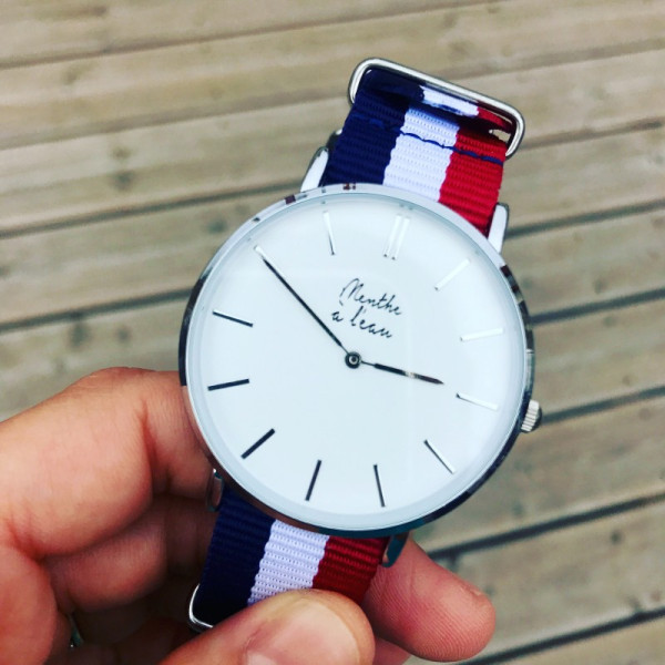 Ø 40 mm (homme) - Cadran blanc avec index assortis - Montre fournie dans son écrin luxe spécifique - Bracelet interchangeable en nylon tressé