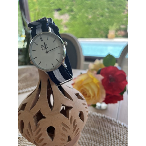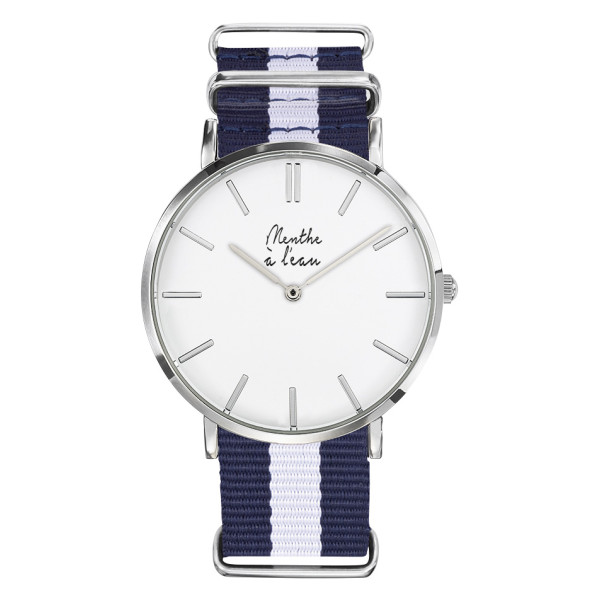 Ø 40 mm (homme) - Cadran blanc avec index assortis - Montre fournie dans son écrin luxe spécifique - Bracelet interchangeable en nylon tressé