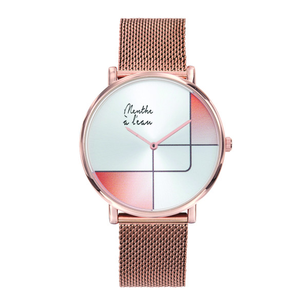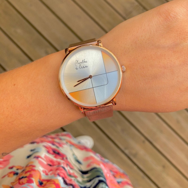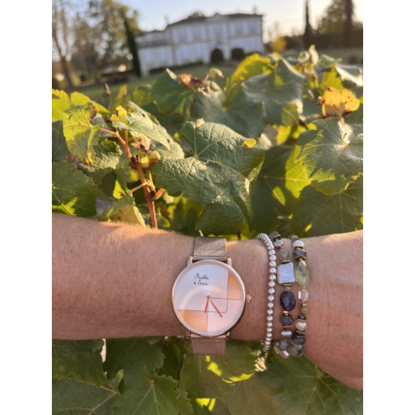 Ø 38 mm - Cadran soleillé design doré rose avec index assortis - Montre fournie dans son écrin luxe spécifique - Bracelet en maille milanaise doré rose - Montre fabriquée en France à Besançon.